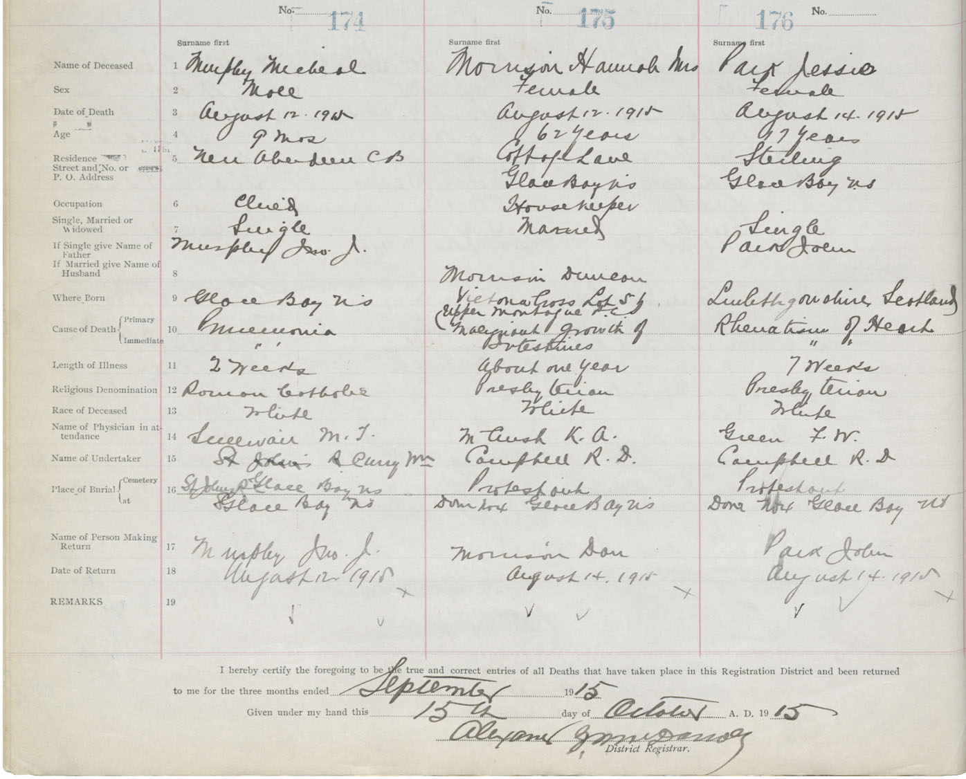 Female Death Registration: Year: 1915 book: 28 page: 34 number: 176