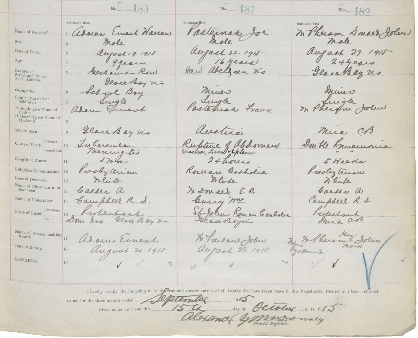 Male Death Registration: Year: 1915 book: 28 page: 35 number: 182