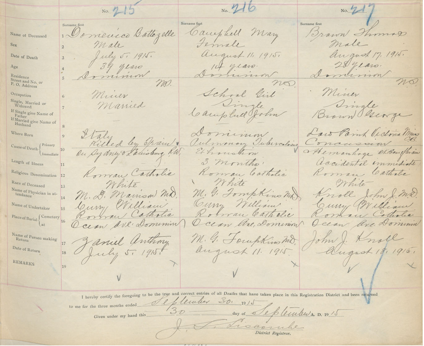 Male Death Registration: Year: 1915 book: 28 page: 41 number: 217