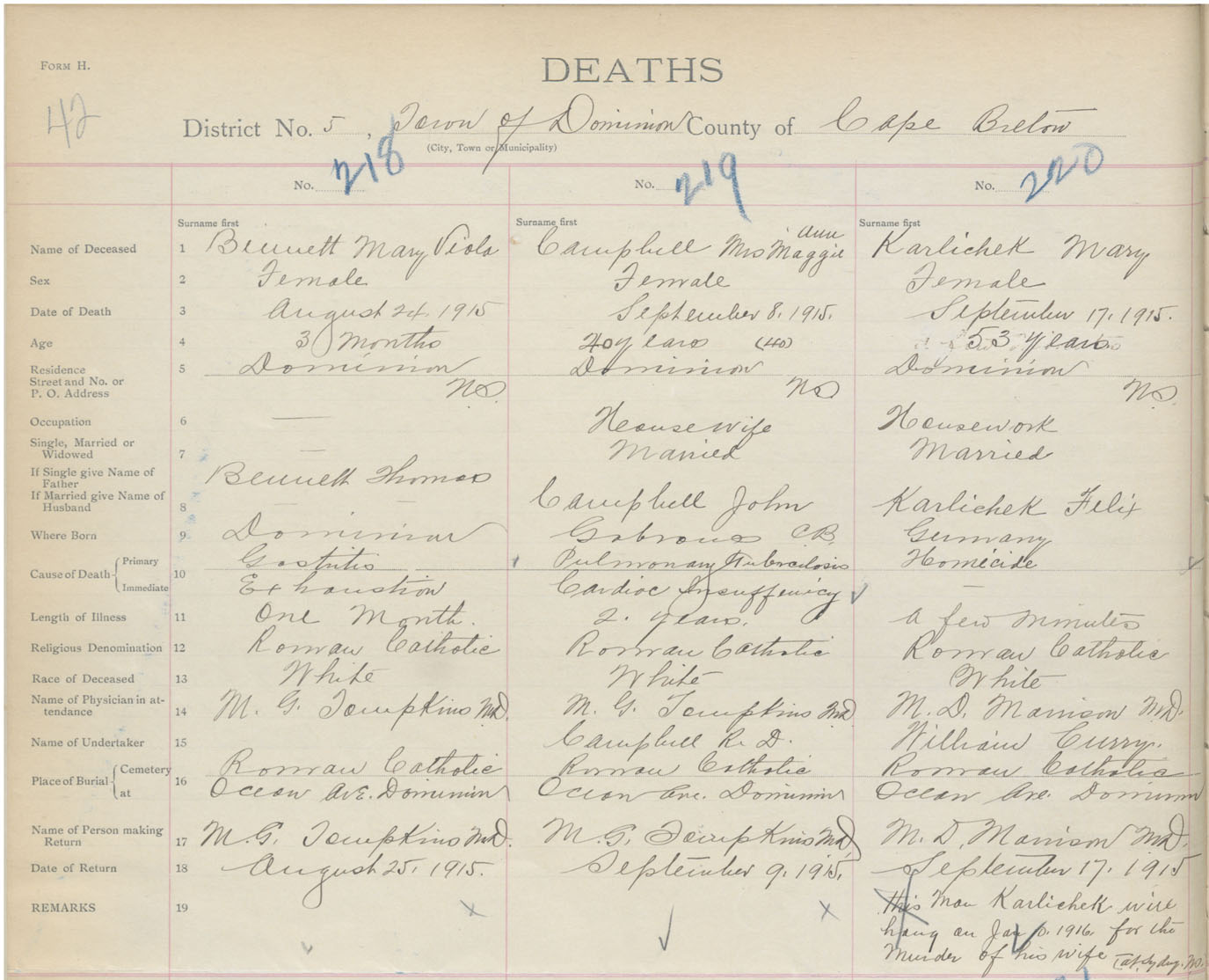 Female Death Registration: Year: 1915 book: 28 page: 42 number: 220