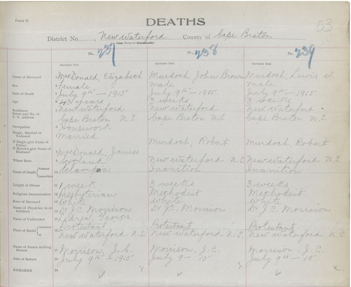 Female Death Registration: Year: 1915 book: 28 page: 53 number: 237