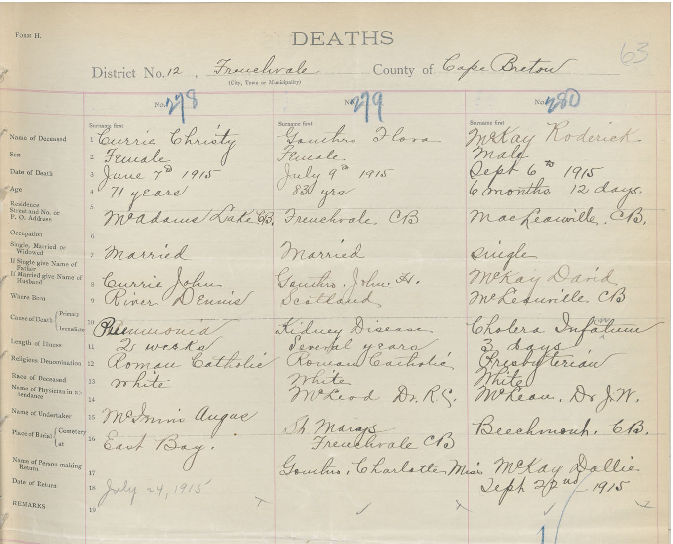 Female Death Registration: Year: 1915 book: 28 page: 63 number: 278