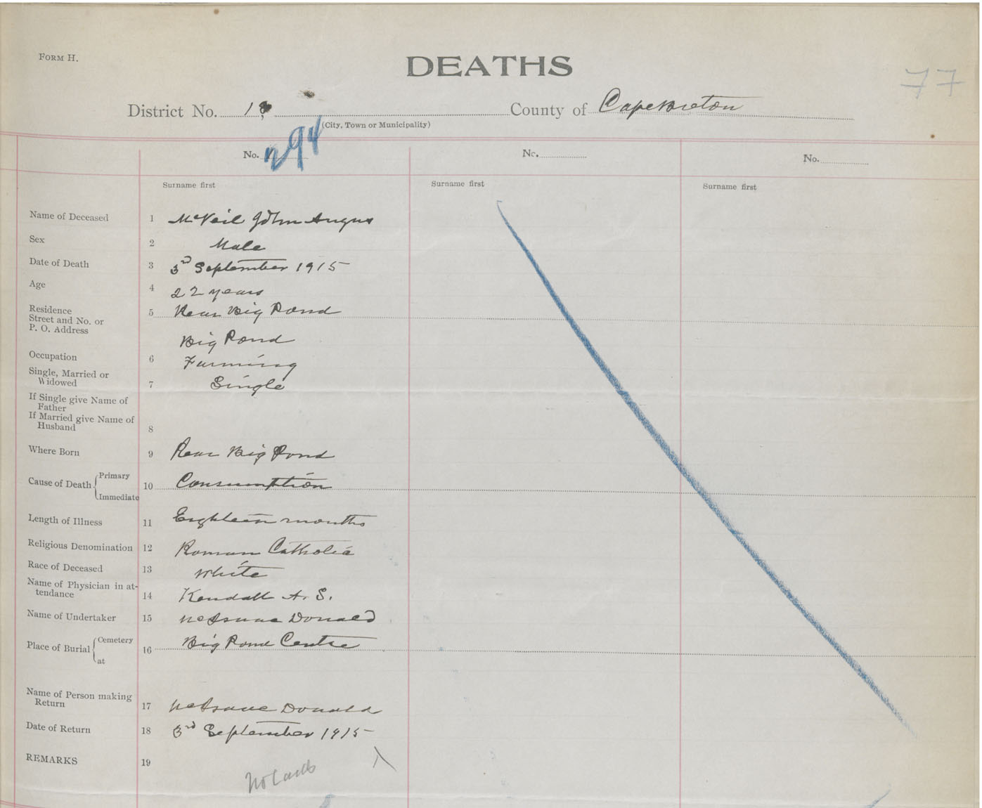 Male Death Registration: Year: 1915 book: 28 page: 77 number: 294