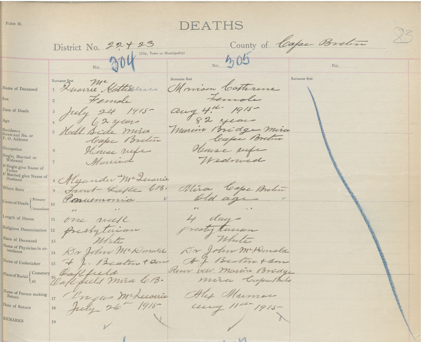 Female Death Registration: Year: 1915 book: 28 page: 83 number: 305