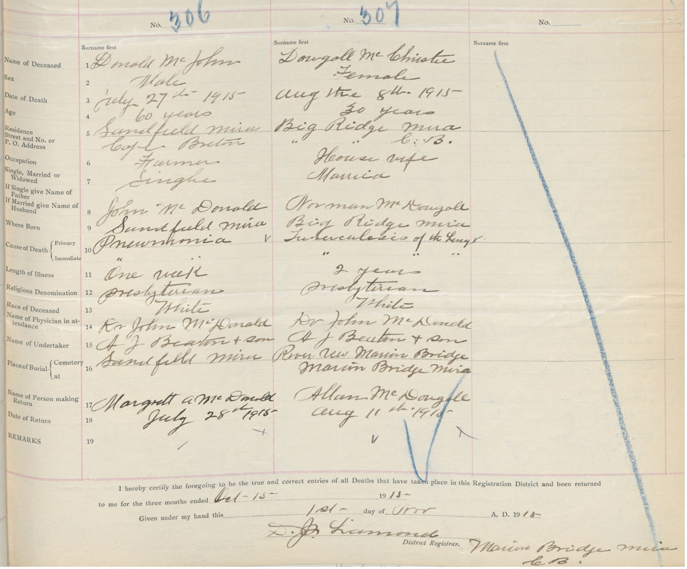 Female Death Registration: Year: 1915 book: 28 page: 83 number: 307