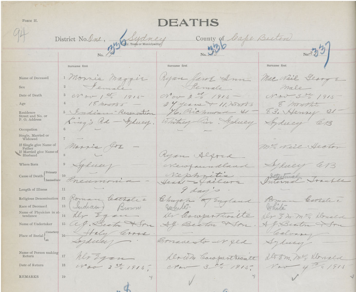 Male Death Registration: Year: 1915 book: 28 page: 94 number: 337
