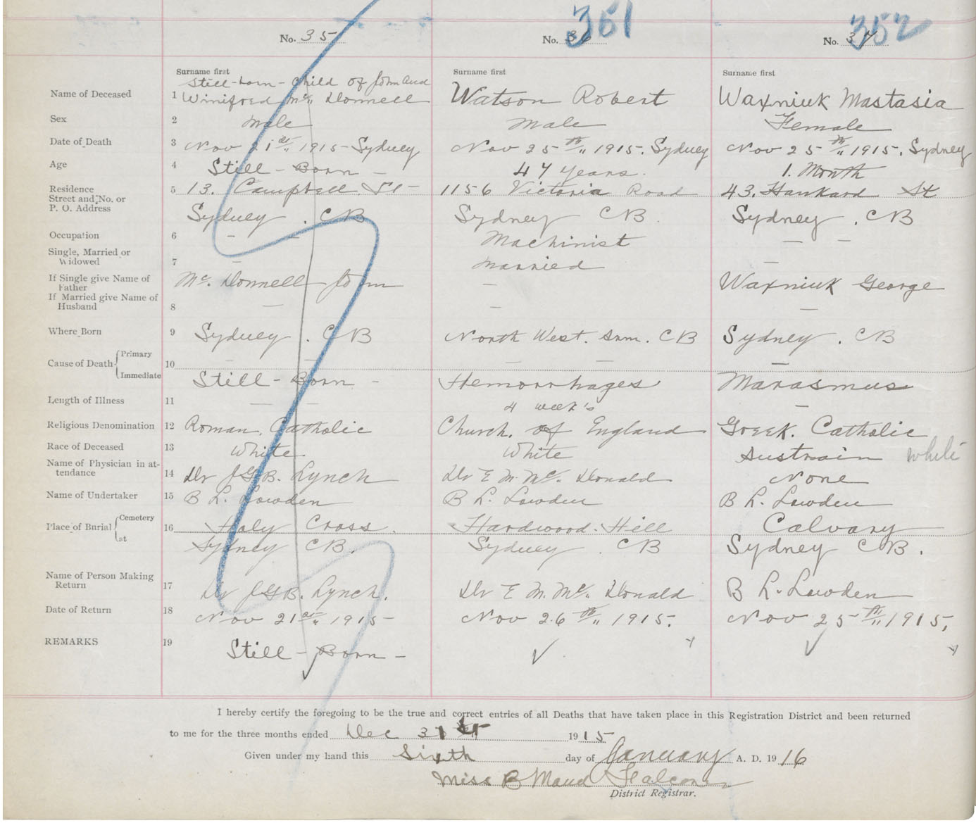 Male Death Registration: Year: 1915 book: 28 page: 96 number: 351