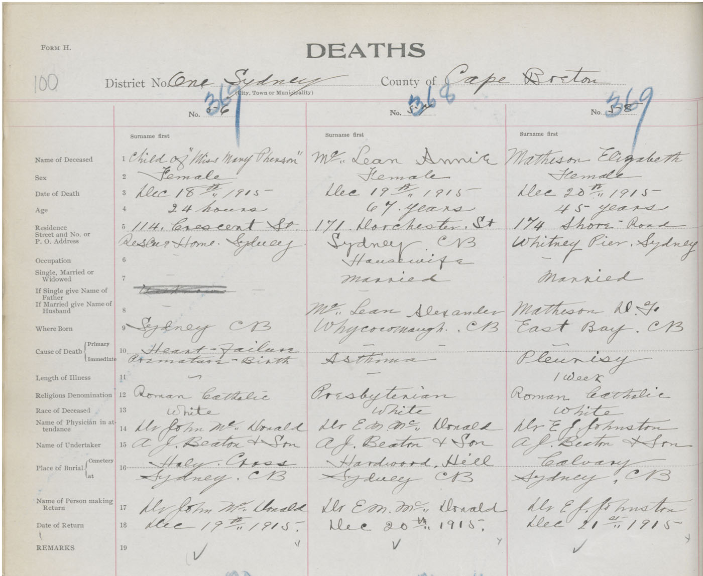 Female Death Registration: Year: 1915 book: 28 page: 100 number: 367