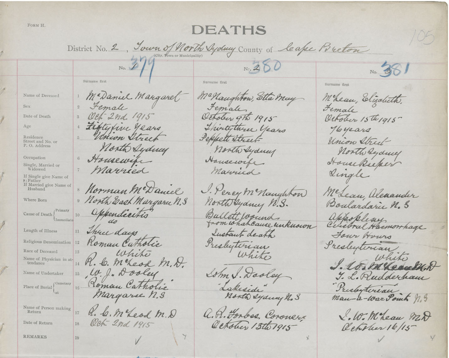 Female Death Registration: Year: 1915 book: 28 page: 105 number: 379
