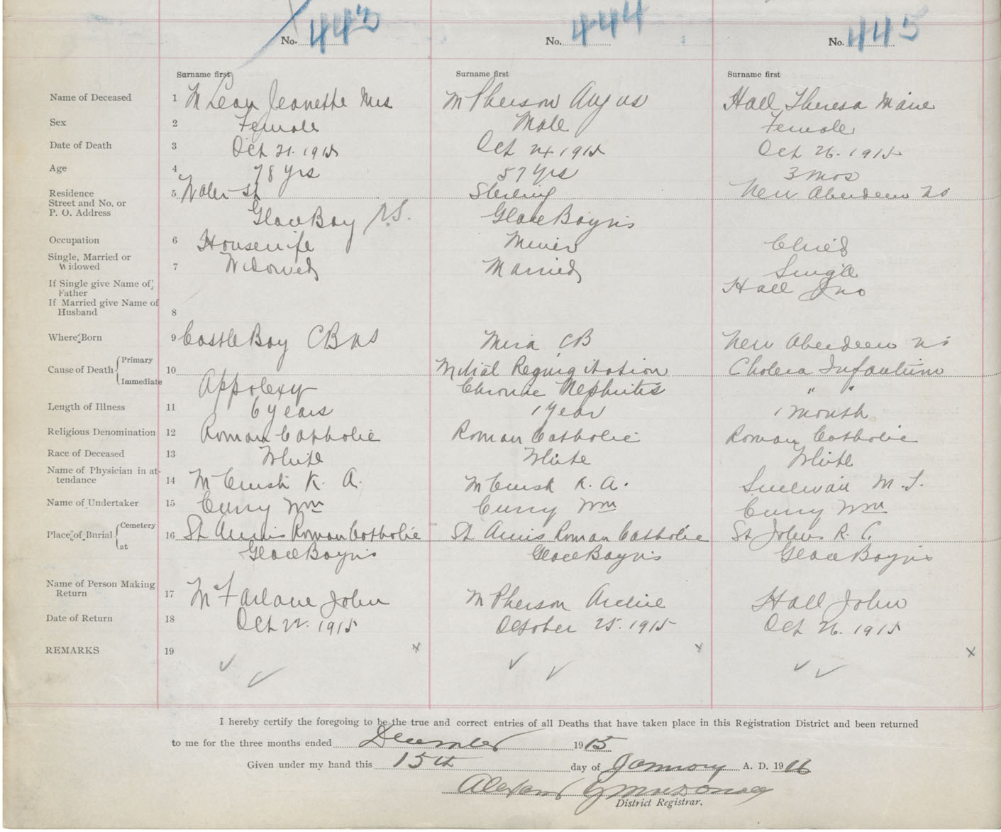 Female Death Registration: Year: 1915 book: 28 page: 120 number: 443