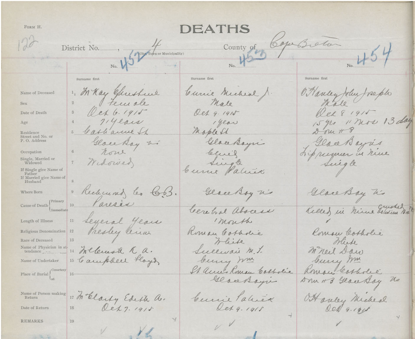 Female Death Registration: Year: 1915 book: 28 page: 122 number: 452