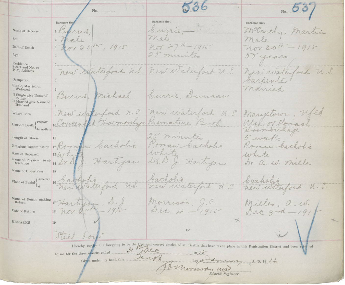 Male Death Registration: Year: 1915 book: 28 page: 145 number: 536