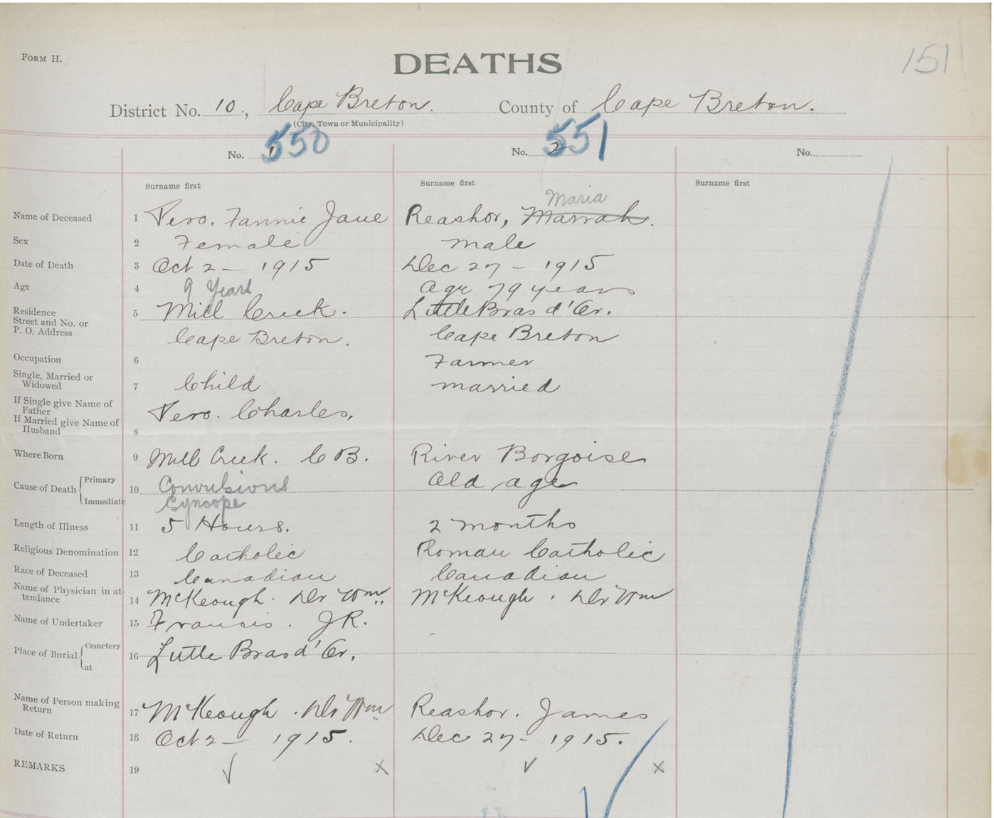 Female Death Registration: Year: 1915 book: 28 page: 151 number: 550