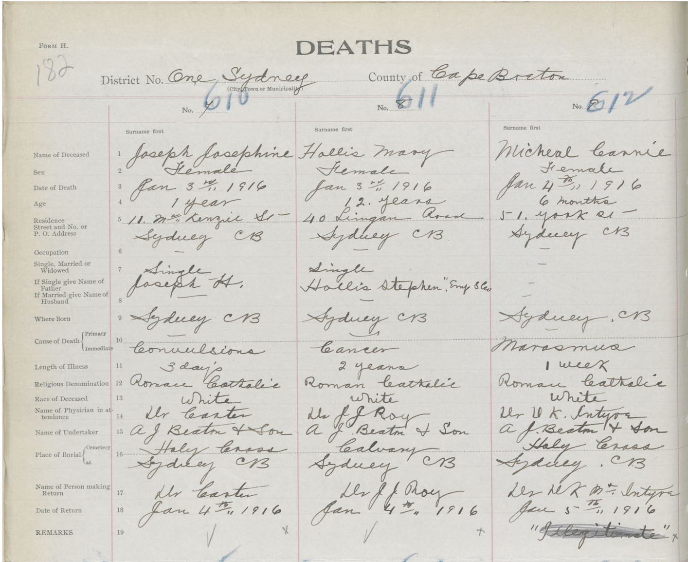 Death Registration: Year: 1916 book: 28 page: 182 number: 612