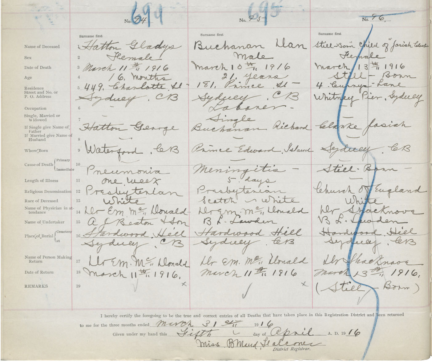 Death Registration: Year: 1916 book: 28 page: 196 number: 695