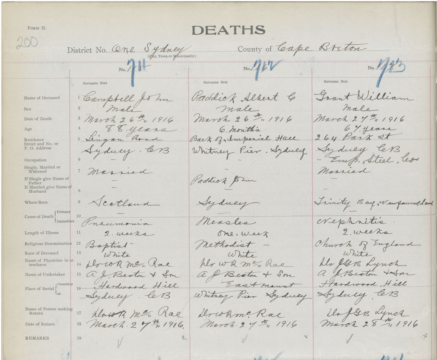 Death Registration: Year: 1916 book: 28 page: 200 number: 713