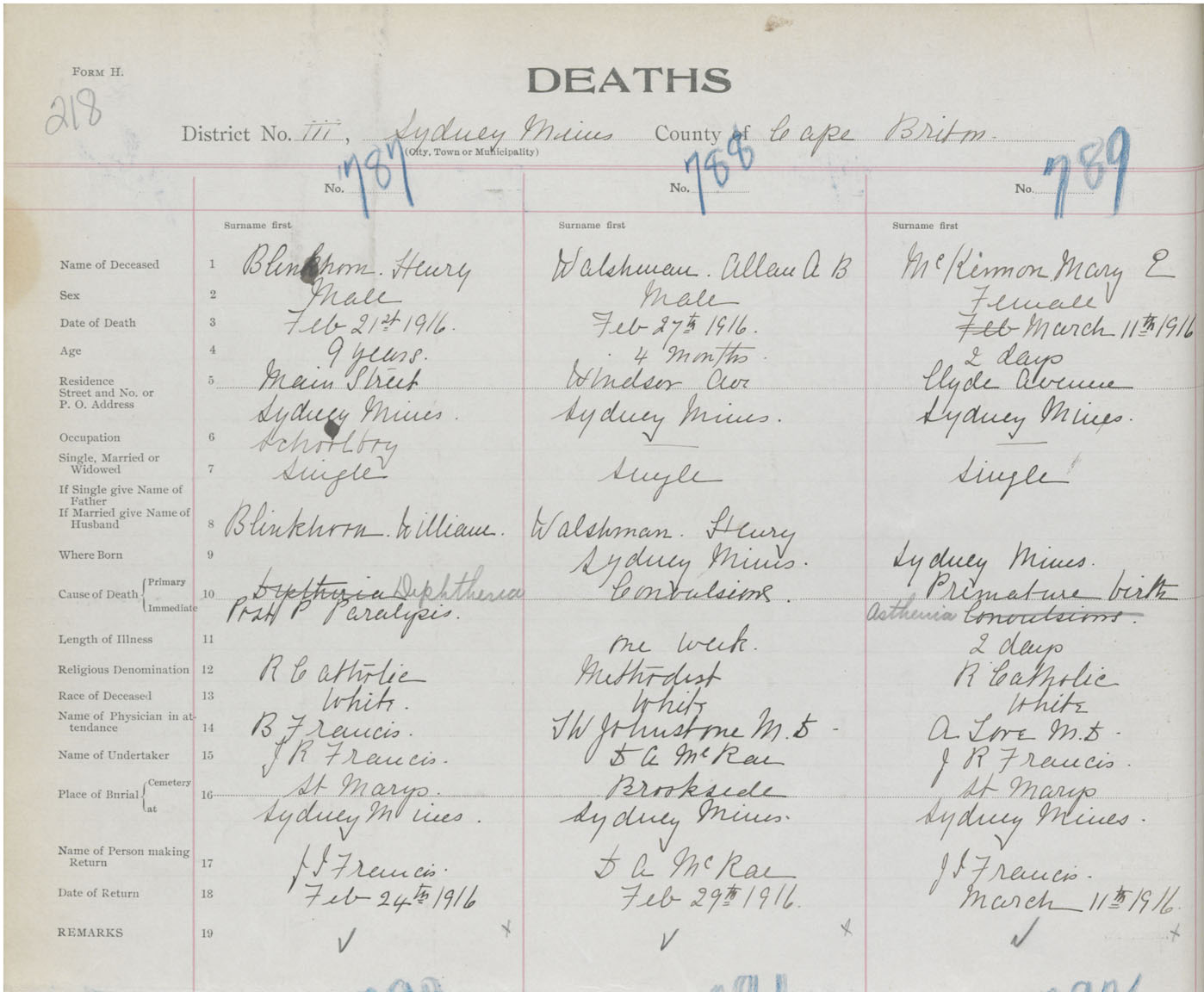 Death Registration: Year: 1916 book: 28 page: 218 number: 789