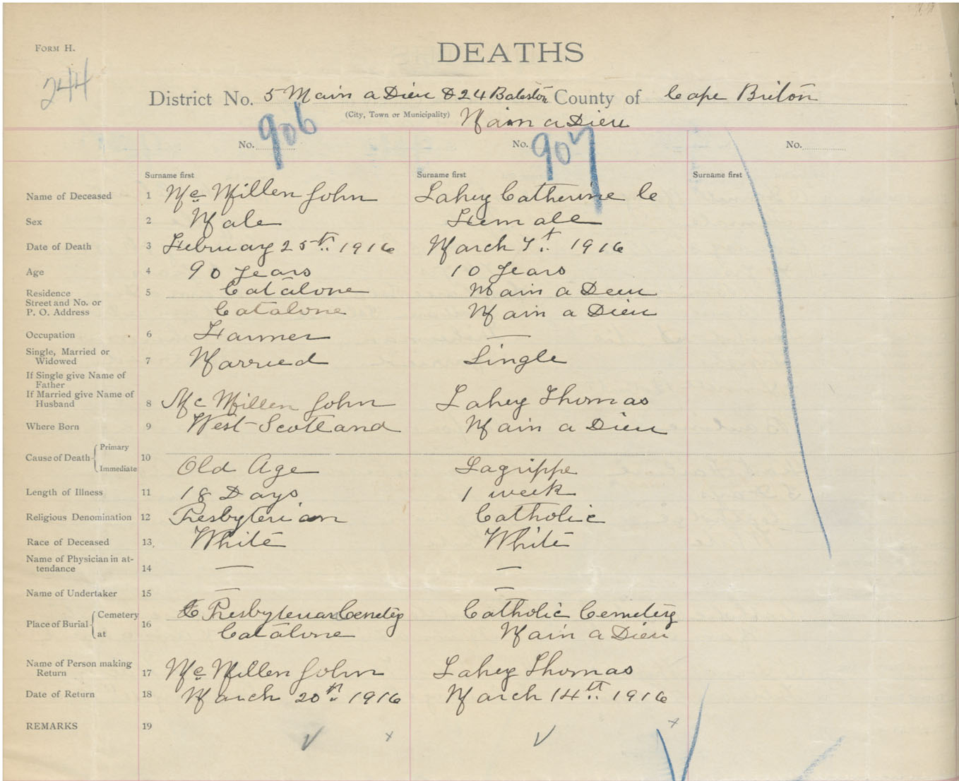 Death Registration: Year: 1916 book: 28 page: 244 number: 906