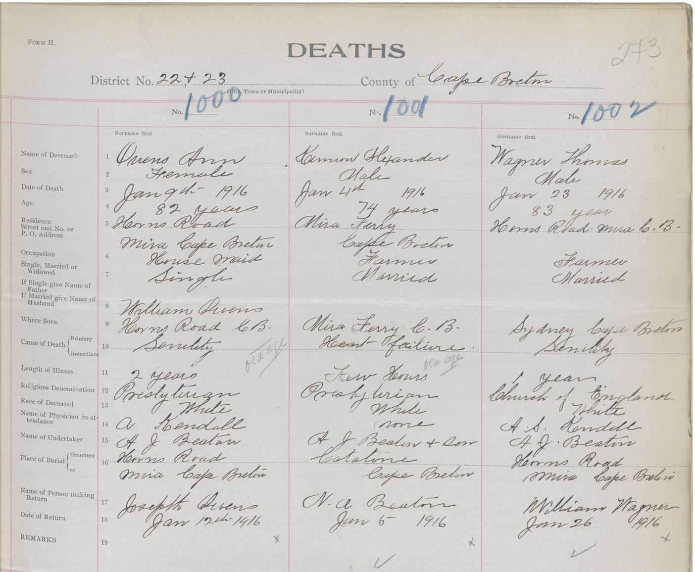 Death Registration: Year: 1916 book: 28 page: 273 number: 1000