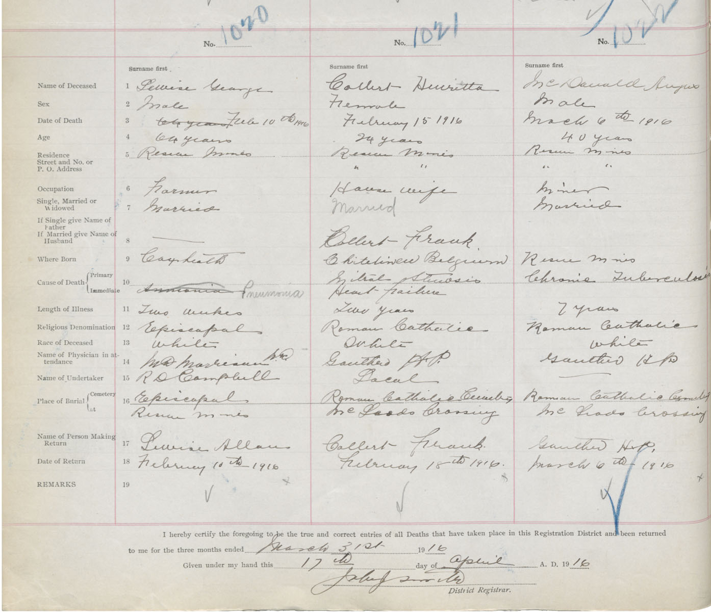 Death Registration: Year: 1916 book: 28 page: 280 number: 1020
