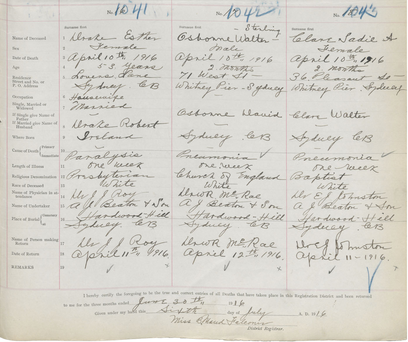 Death Registration: Year: 1916 book: 28 page: 285 number: 1043