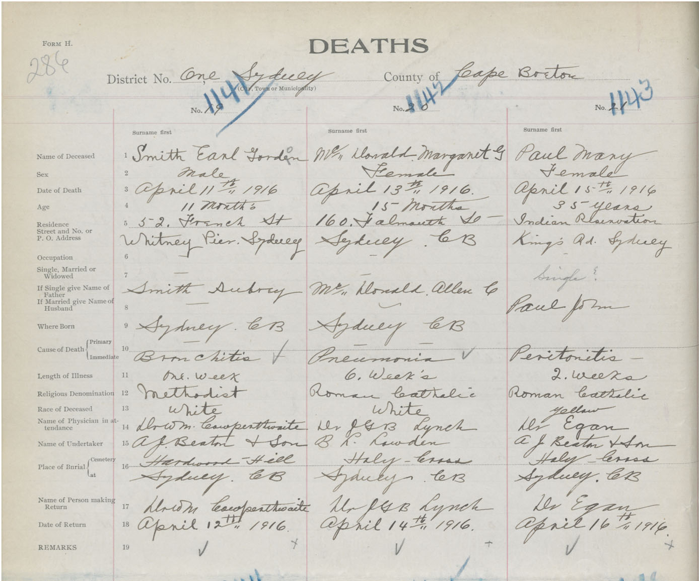 Death Registration: Year: 1916 book: 28 page: 286 number: 1143