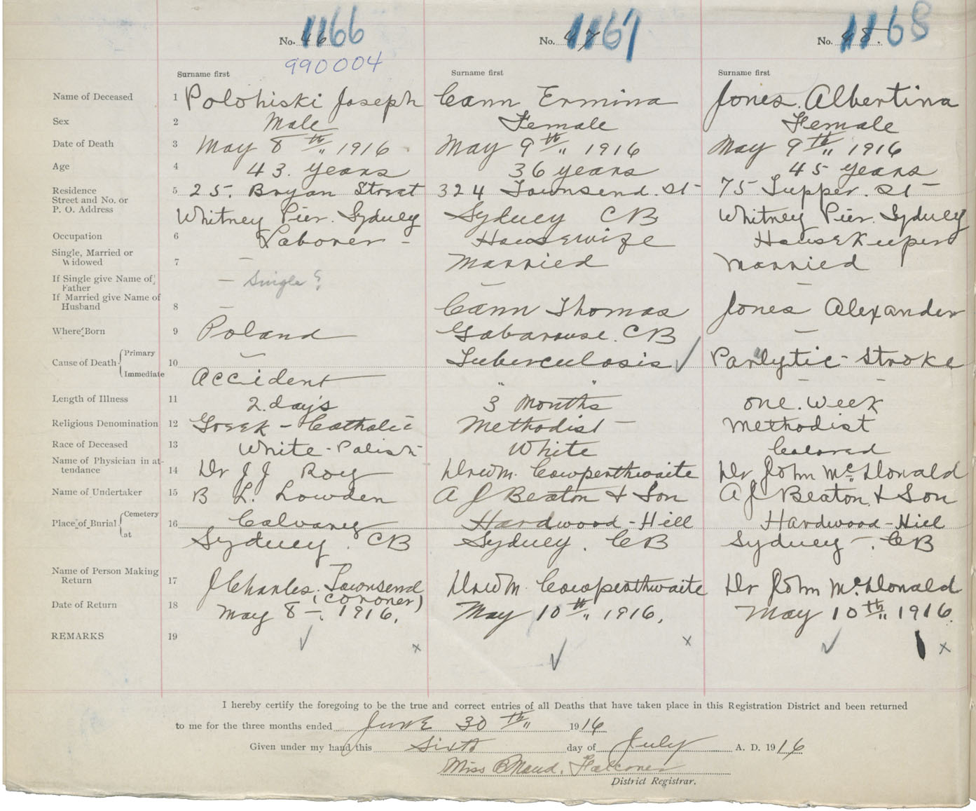 Death Registration: Year: 1916 book: 28 page: 290 number: 1168