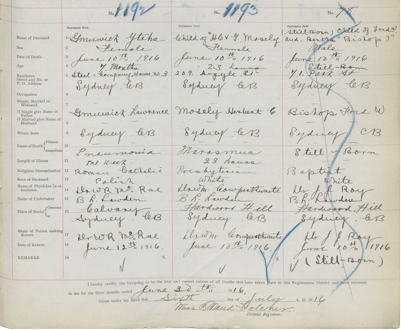 Death Registration: Year: 1916 book: 28 page: 295 number: 1193