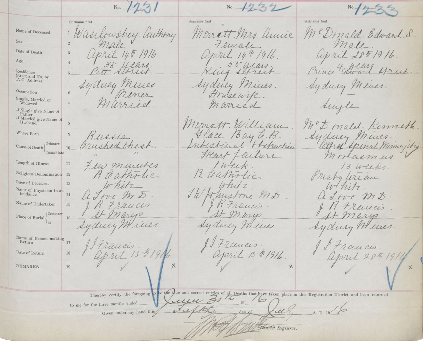 Death Registration: Year: 1916 book: 28 page: 307 number: 1233