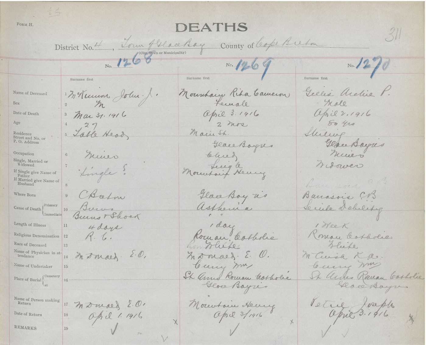 Death Registration: Year: 1916 book: 28 page: 311 number: 1270