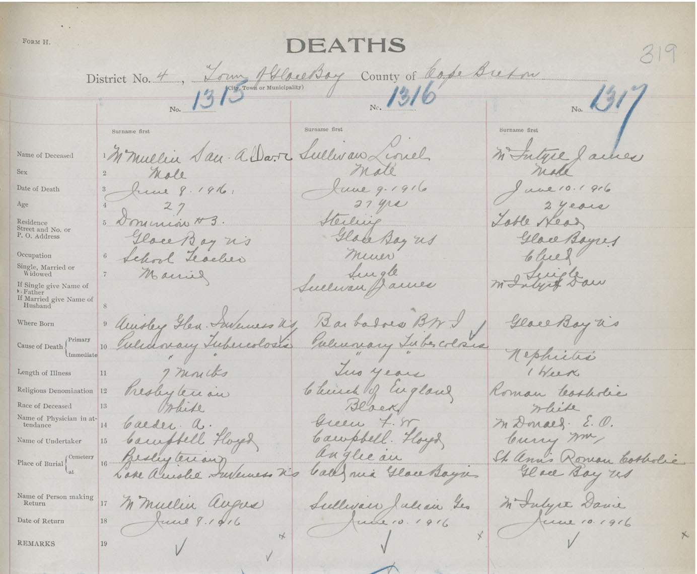Death Registration: Year: 1916 book: 28 page: 319 number: 1315