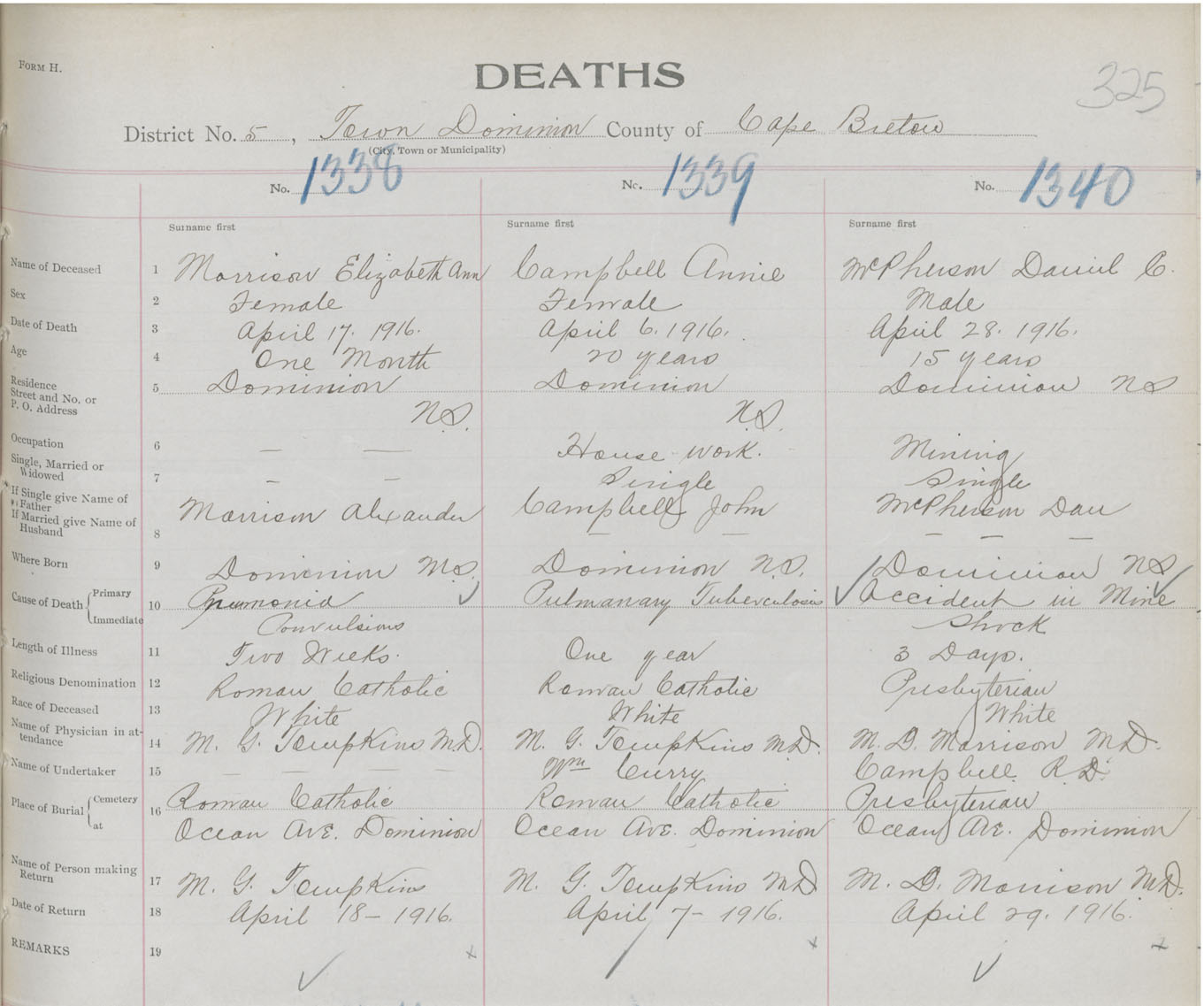 Death Registration: Year: 1916 book: 28 page: 325 number: 1338
