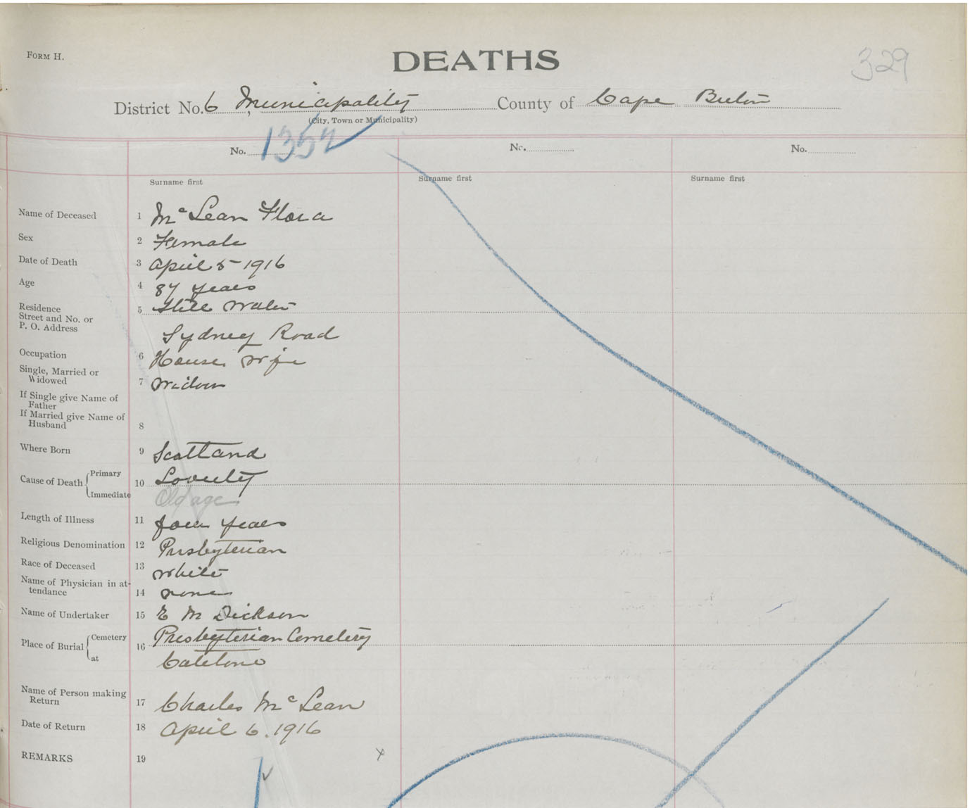 Death Registration: Year: 1916 book: 28 page: 329 number: 1352