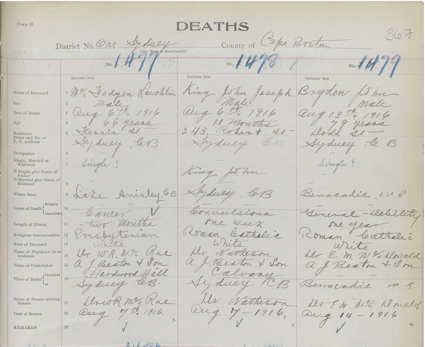 Death Registration: Year: 1916 book: 28 page: 367 number: 1479
