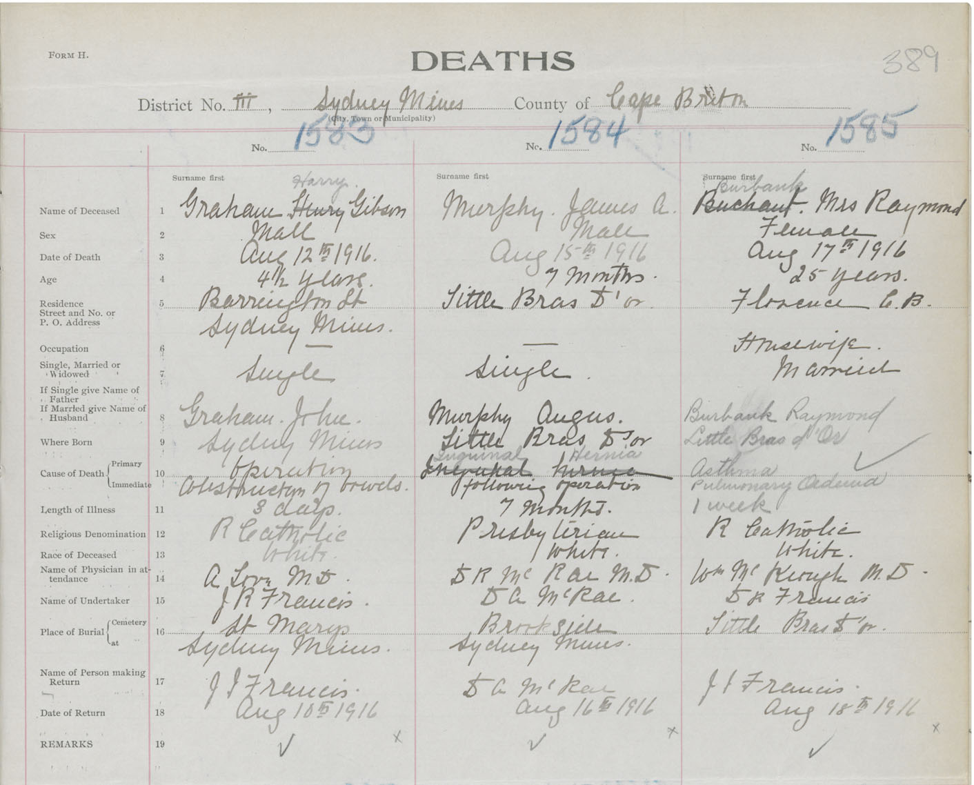 Death Registration: Year: 1916 book: 28 page: 389 number: 1585
