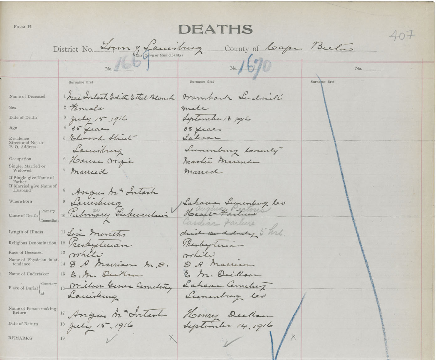 Death Registration: Year: 1916 book: 28 page: 407 number: 1670
