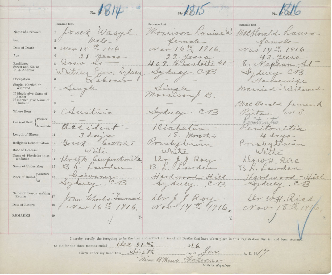 Death Registration: Year: 1916 book: 28 page: 453 number: 1816