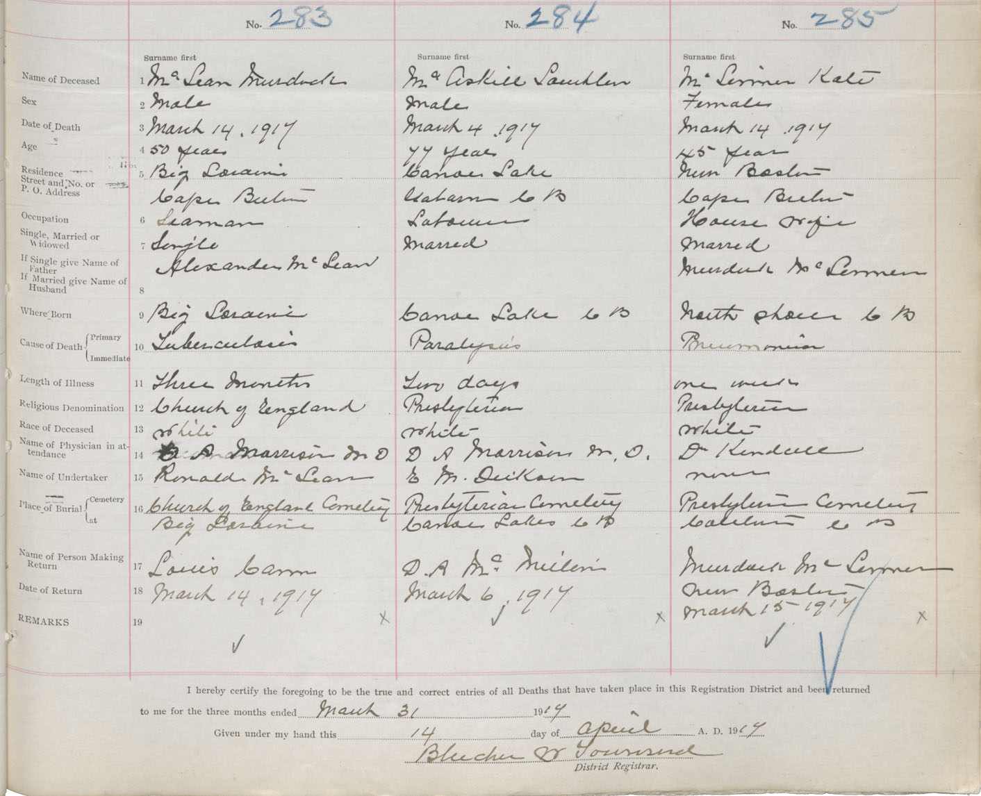 Death Registration: Year: 1917 book: 29 page: 55 number: 285