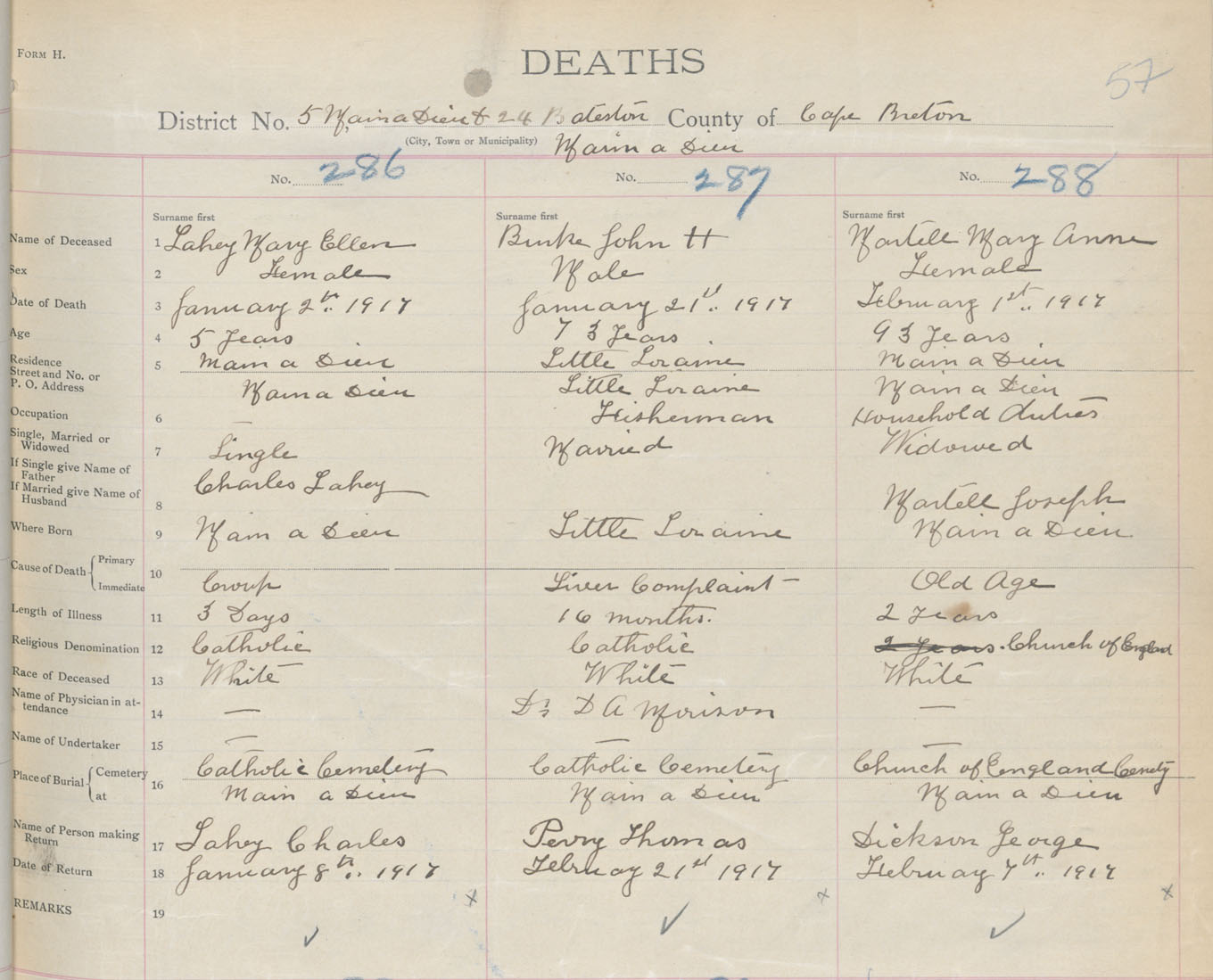 Death Registration: Year: 1917 book: 29 page: 57 number: 288