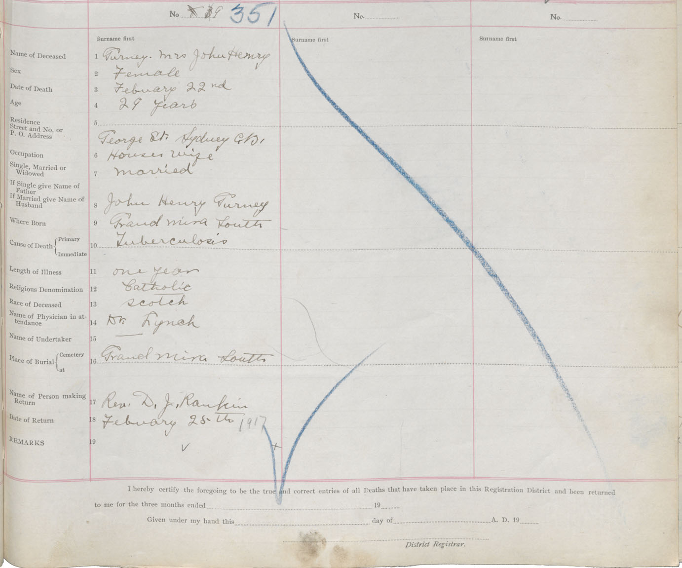 Death Registration: Year: 1917 book: 29 page: 85 number: 351