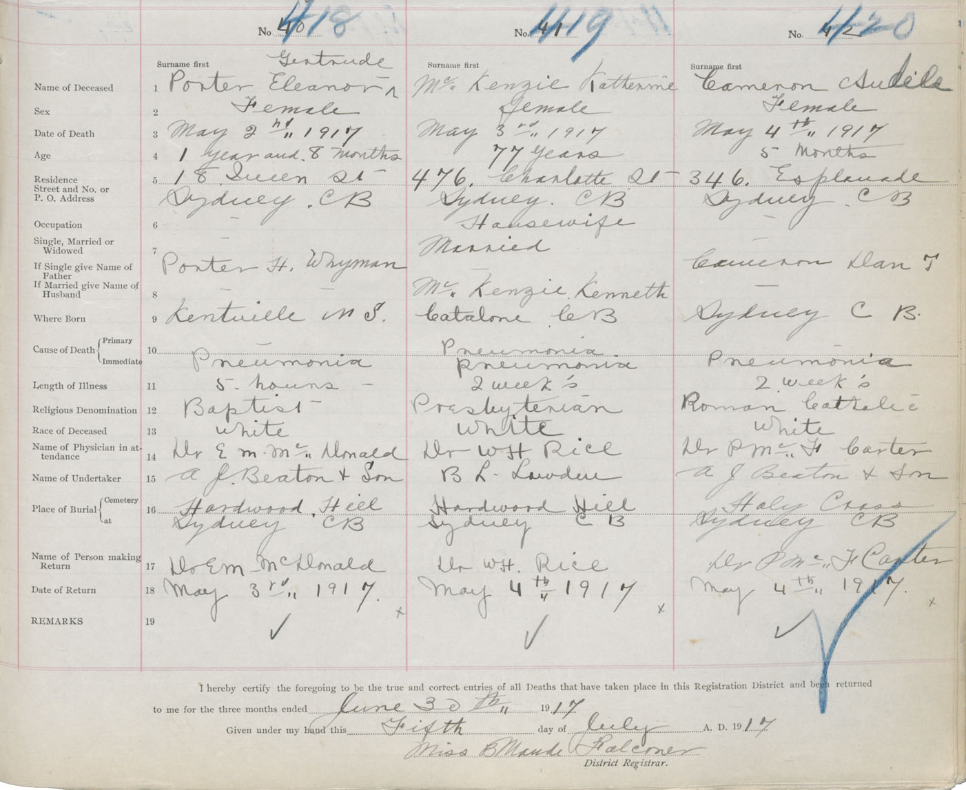 Death Registration: Year: 1917 book: 29 page: 103 number: 418