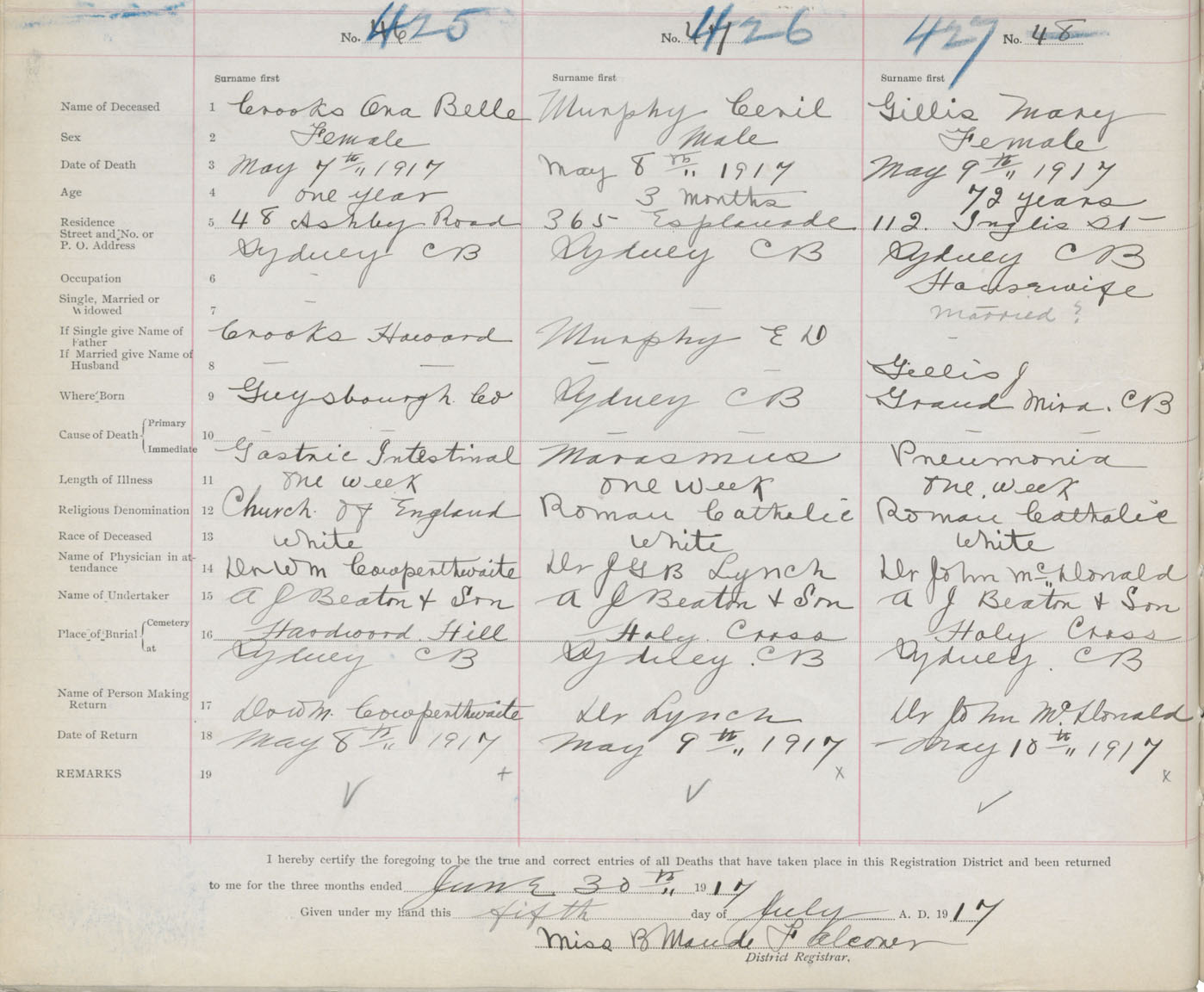 Death Registration: Year: 1917 book: 29 page: 104 number: 425