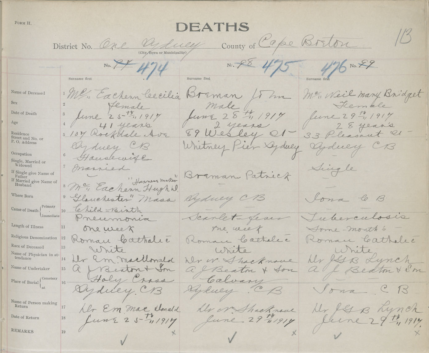 Death Registration: Year: 1917 book: 29 page: 113 number: 474
