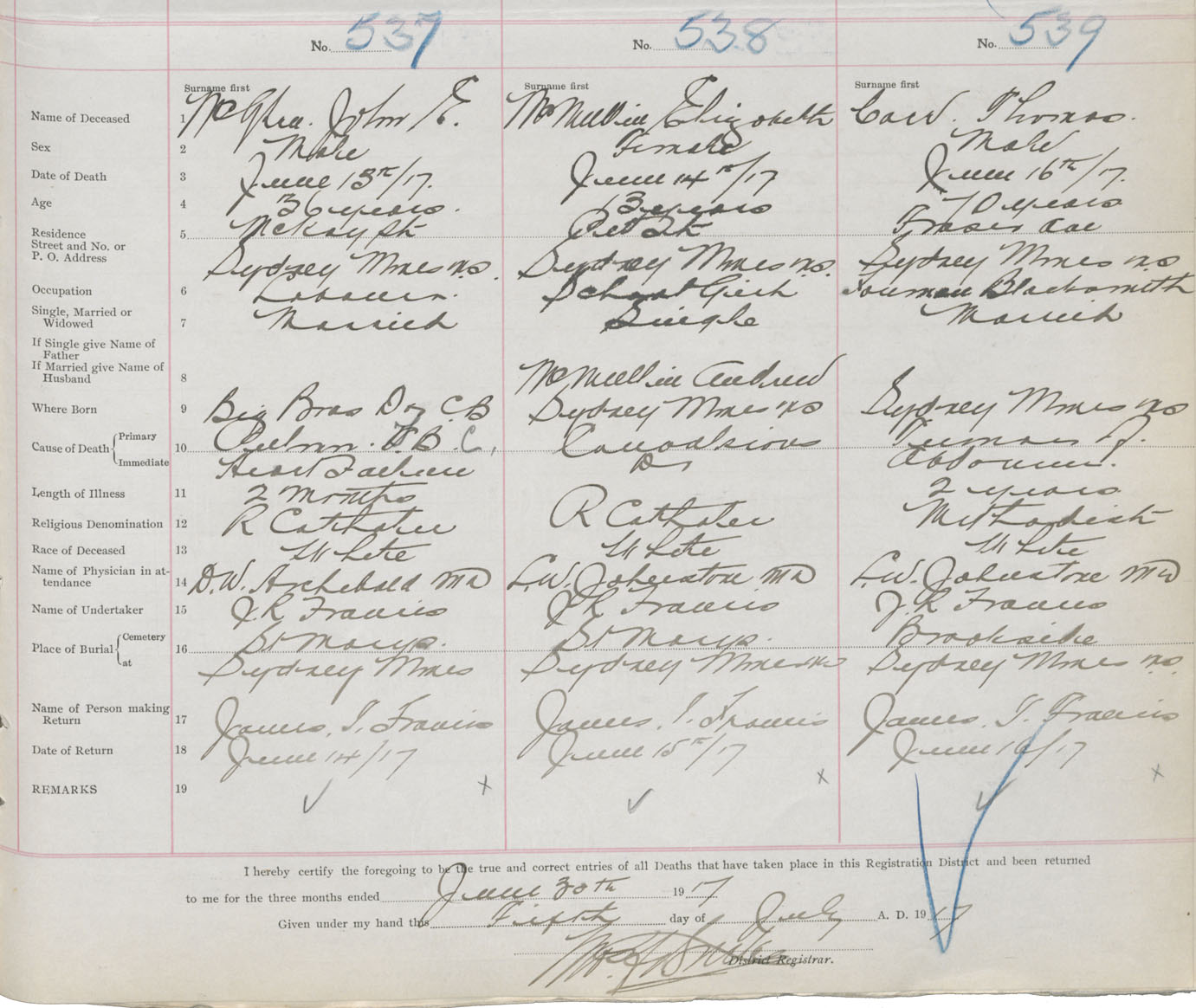 Death Registration: Year: 1917 book: 29 page: 127 number: 539