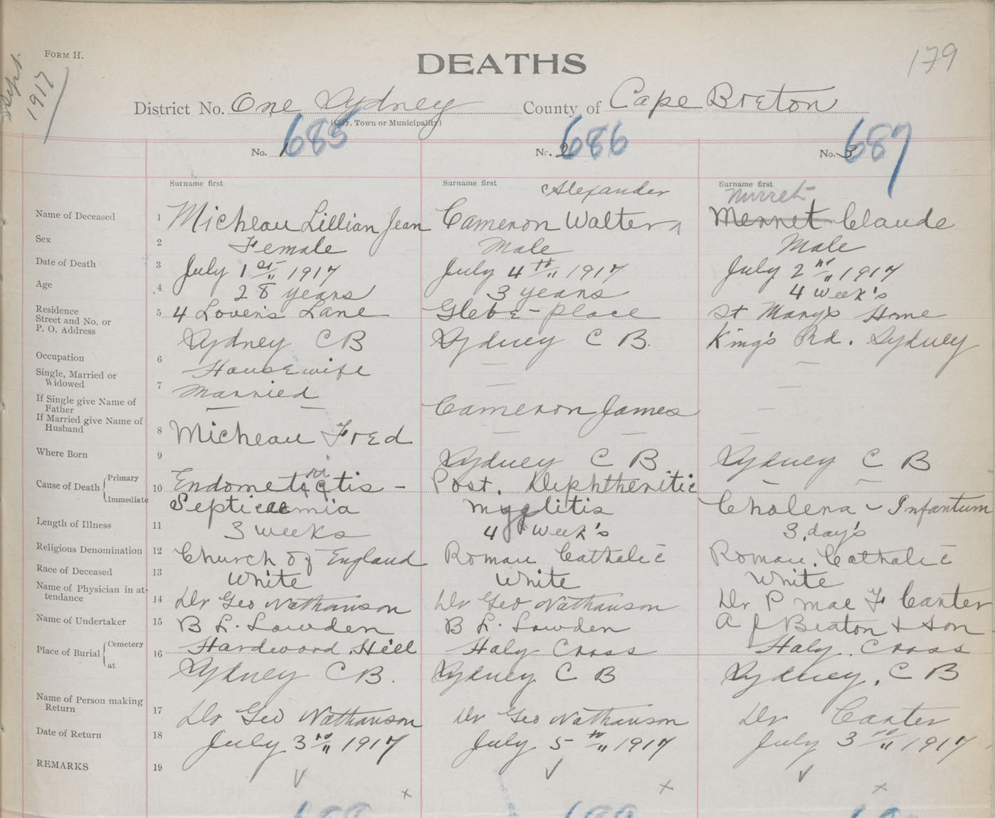 Death Registration: Year: 1917 book: 29 page: 179 number: 685