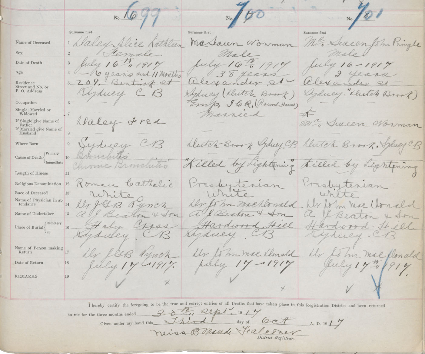 Death Registration: Year: 1917 book: 29 page: 181 number: 699