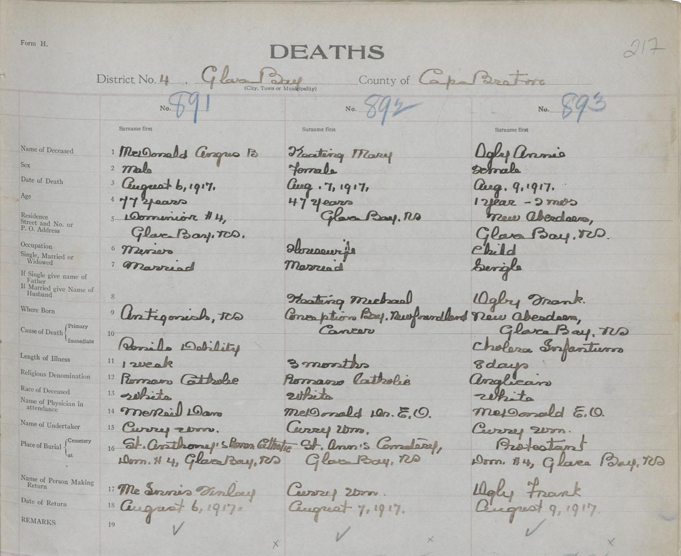 Female Death Registration: Year: 1917 book: 29 page: 217 number: 893
