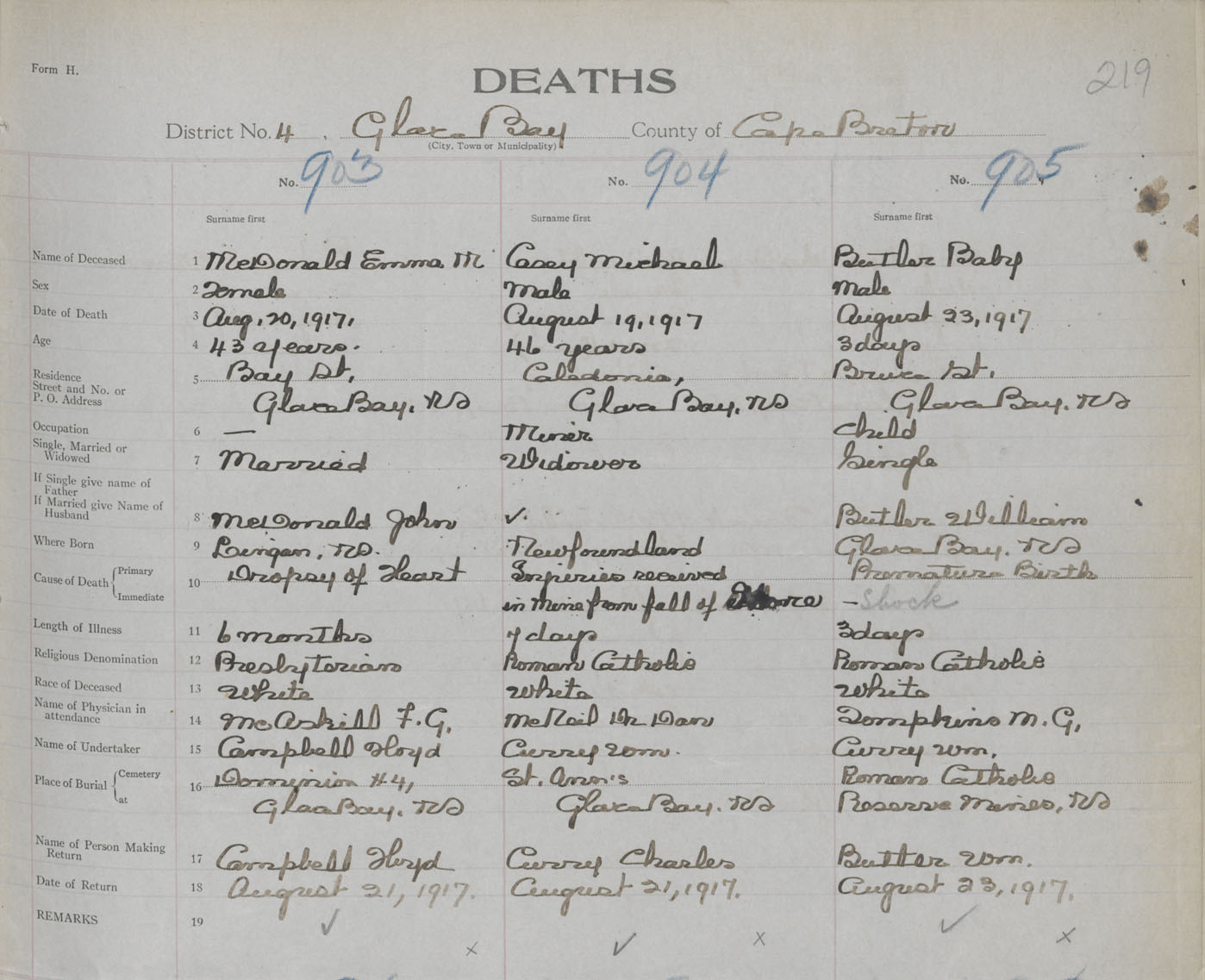 Death Registration: Year: 1917 book: 29 page: 219 number: 905
