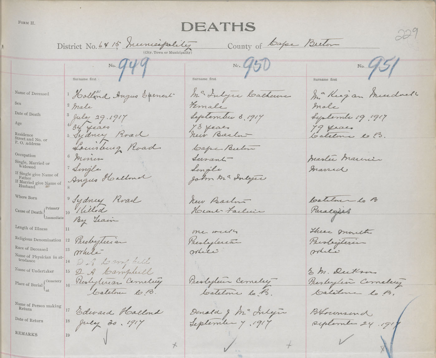 Death Registration: Year: 1917 book: 29 page: 229 number: 951