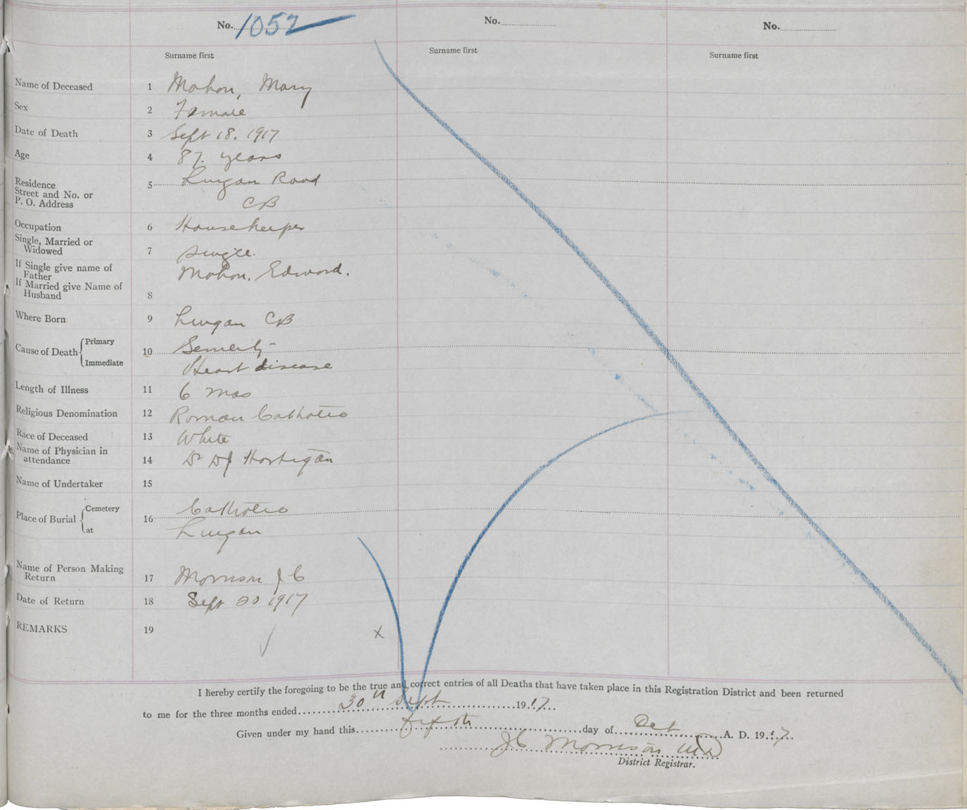 Death Registration: Year: 1917 book: 29 page: 253 number: 1052